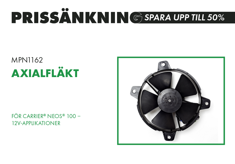 Comex®-fläkt utvecklad för att passa Carrier® Neos® 100 12V-applikationer, med betydande besparingar jämfört med OEM-referenserna 54-00620-01 och 54-00620-00.